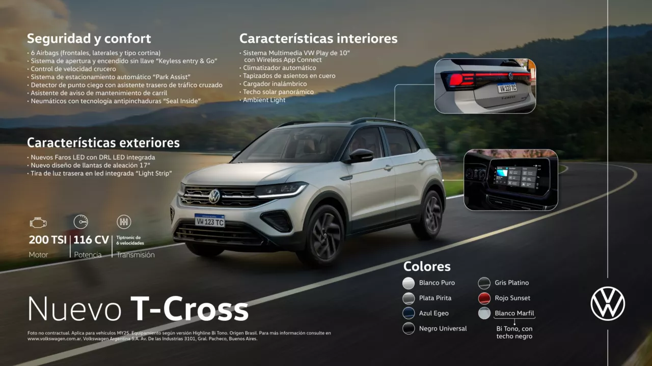 Las versiones del Nuevo T-Cross Comfortline, Highline y Bitono poseen un motor 200TSI de 116 CV, que genera menor consumo de combustible y eleva la performance del vehículo aportando una sensación deportiva al manejo. Además, posee una transmisión automática Tiptronic de seis velocidades, proporcionando adaptabilidad, eficiencia y versatilidad para una experiencia de conducción excepcional.