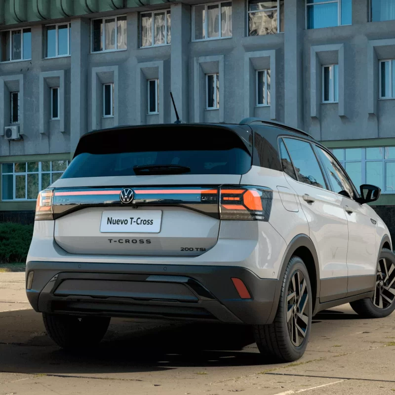 El Nuevo T-Cross destaca por sus líneas de diseño sofisticadas y paragolpes renovados que ofrecen mayor protección. La nueva parrilla y el aplique inferior más grandes refuerzan la elegancia del SUVW y su sensación de robustez. Además, cuenta con llantas de 17» direccionales y diamantadas, junto con nuevas luces y faros VW LED que aportan un toque moderno e innovador.