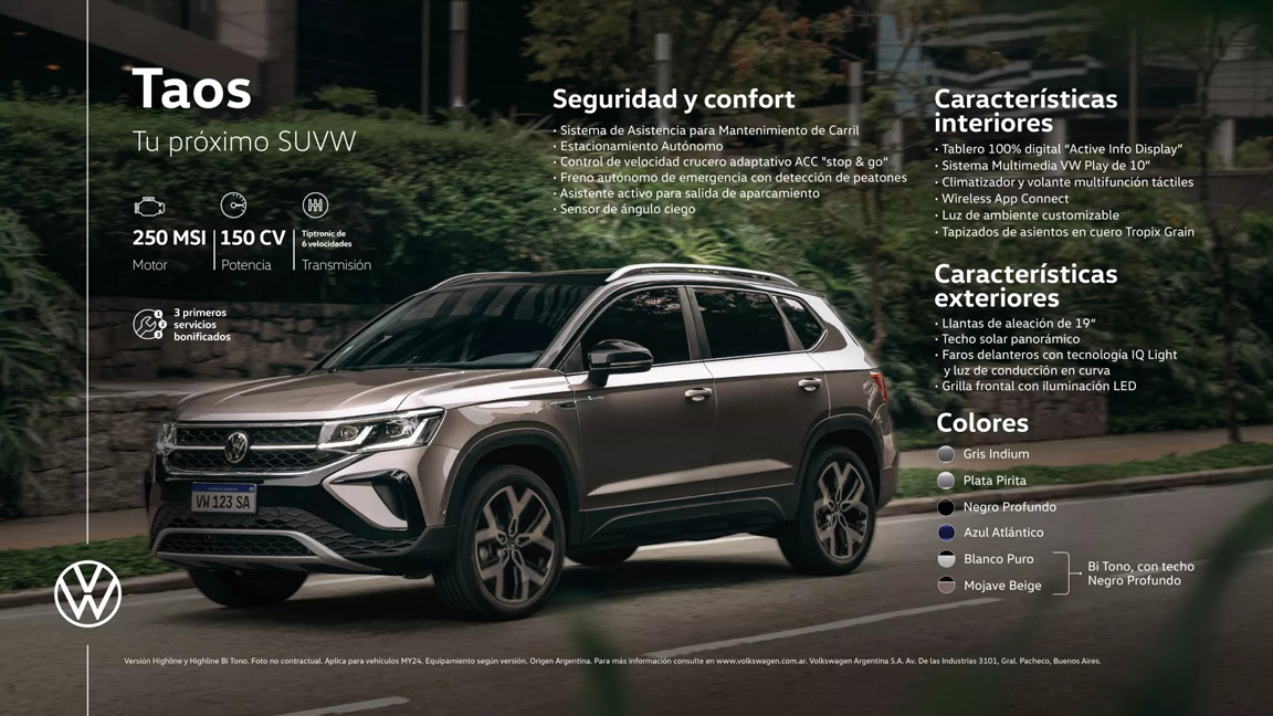 Las imágenes publicadas en este sitio son de carácter ilustrativo. Consulte equipamientos y especificaciones técnicas en nuestra red de concesionarios oficiales. Ver términos y condiciones de campañas y promociones en www.volkswagen.com.ar