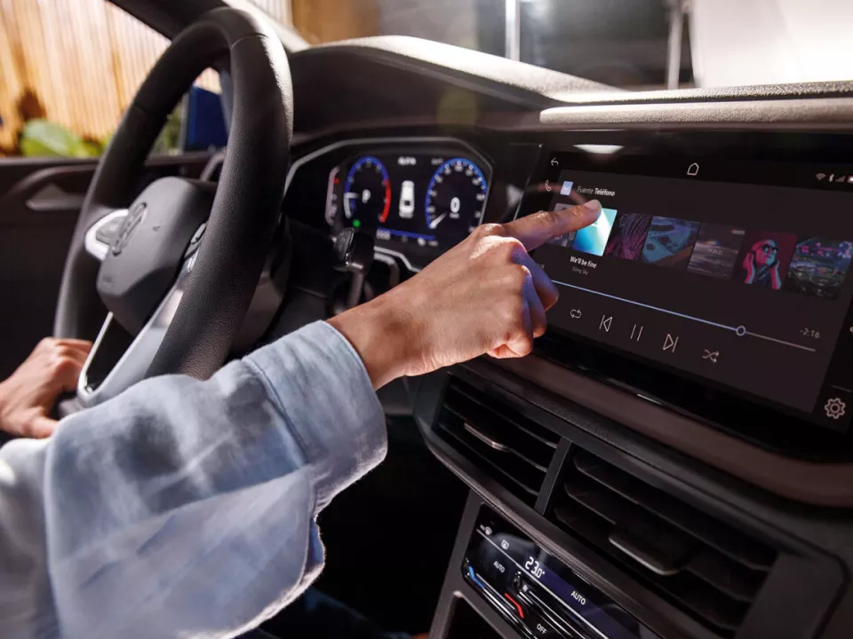 Panel digital multimedia VW Play de 10” , además de asientos, puertas y panel con costuras diferenciadas y detalles que llevan el nombre de la versión.